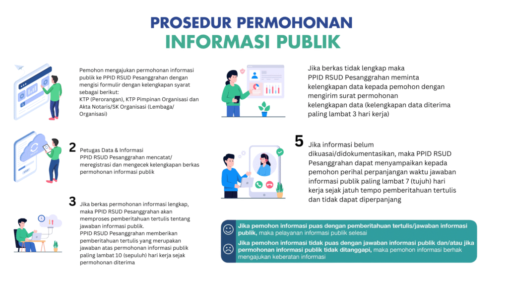 - Jika berkas permohonan informasi lengkpa, maka PPID RSUD Pesanggrahan akan memproses pemberitahuan tertulis tentang jawaban informasi publik . PPID RSUD Pesanggrahan memberikan pemberitahuan tertulis yang merupakan jawaban atas permohonan informasi publik paling lambat 10 (sepuluh) hari kerja sejak permohonan kerja diterima.