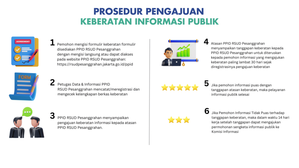 - Atasan Petugas data dan informasi PPID RSUD Pesanggrahan menyampaikan tanggapan keberatan PPID RSUD Pesanggrahan untuk diteruskan kepada pemohon informasi yang mengajukan kaberatan paling lambat 30 hari sejak diregistrasikan pengajuan keberatan